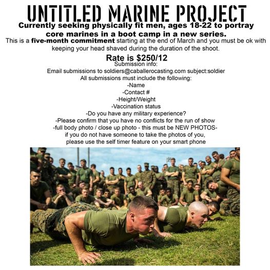 If selected, you will be hired full-time (5 DAYS A WEEK) at the rate of $250/12. This is a FIVE-MONTH COMMITMENT starting at the end of March/beginning of April! You must be 100% available. You must be willing to shave your head (and keep shaved) for the run of the project. You must be in good physical shape and able to perform boot camp exercises