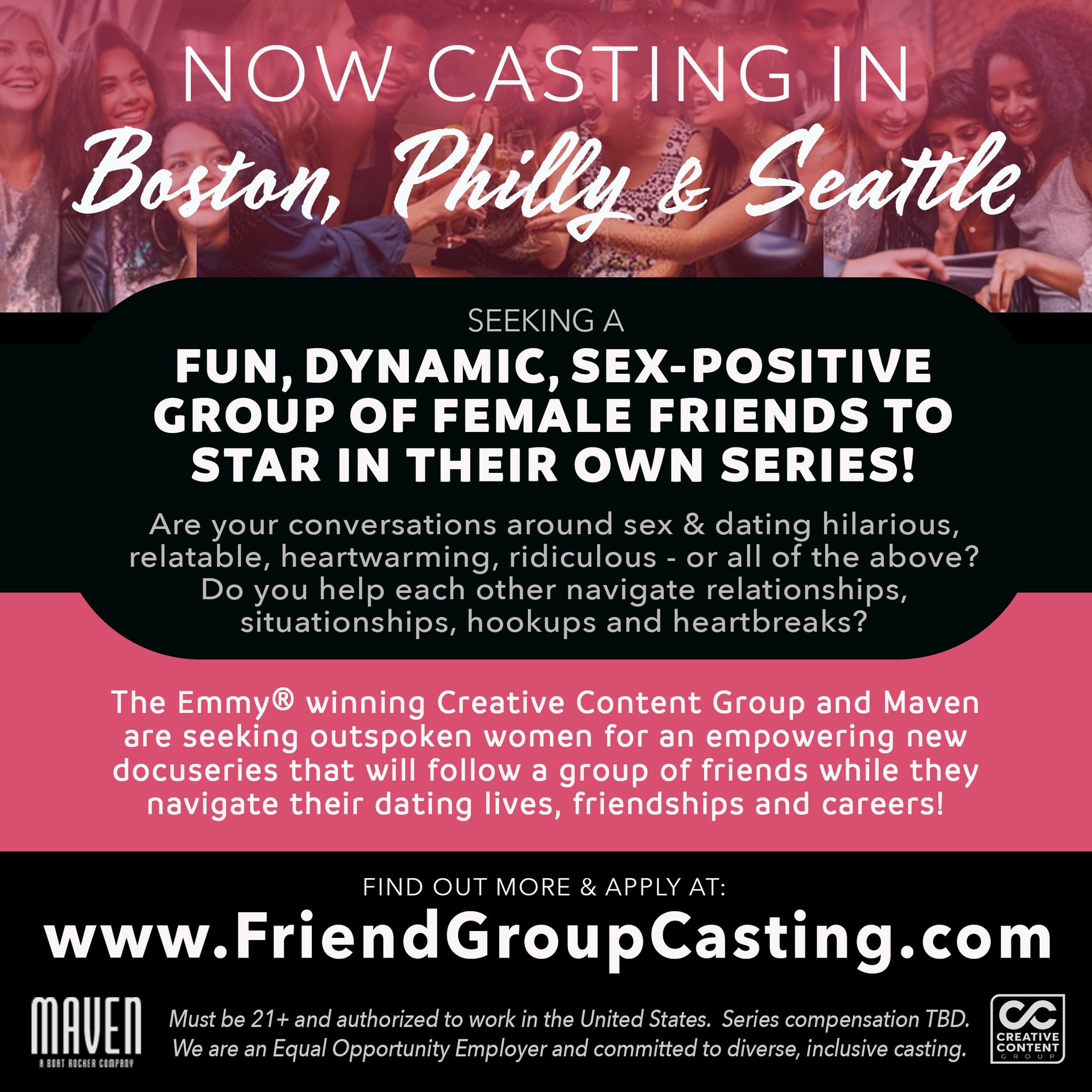 The Emmy® winning Creative Content Group and Maven are seeking outspoken women for an empowering new docu-series that will follow a group of friends while they navigate their dating lives, friendships and careers!