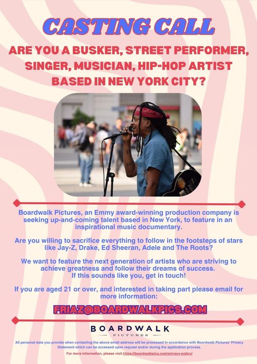 Boardwalk Pictures, an Emmy award-winning production company is seeking up-and-coming talent based in New York, to feature in an inspirational music documentary.
