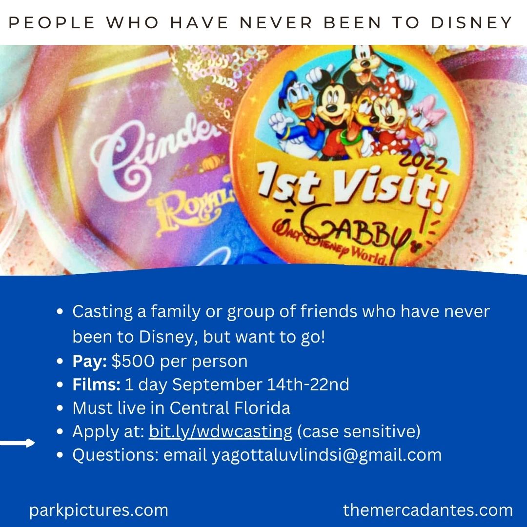 Casting first time Disney goers for an upcoming commercial to be filmed AT THE PARK – Family or group of friends who have never been to Disney, but want to go!
