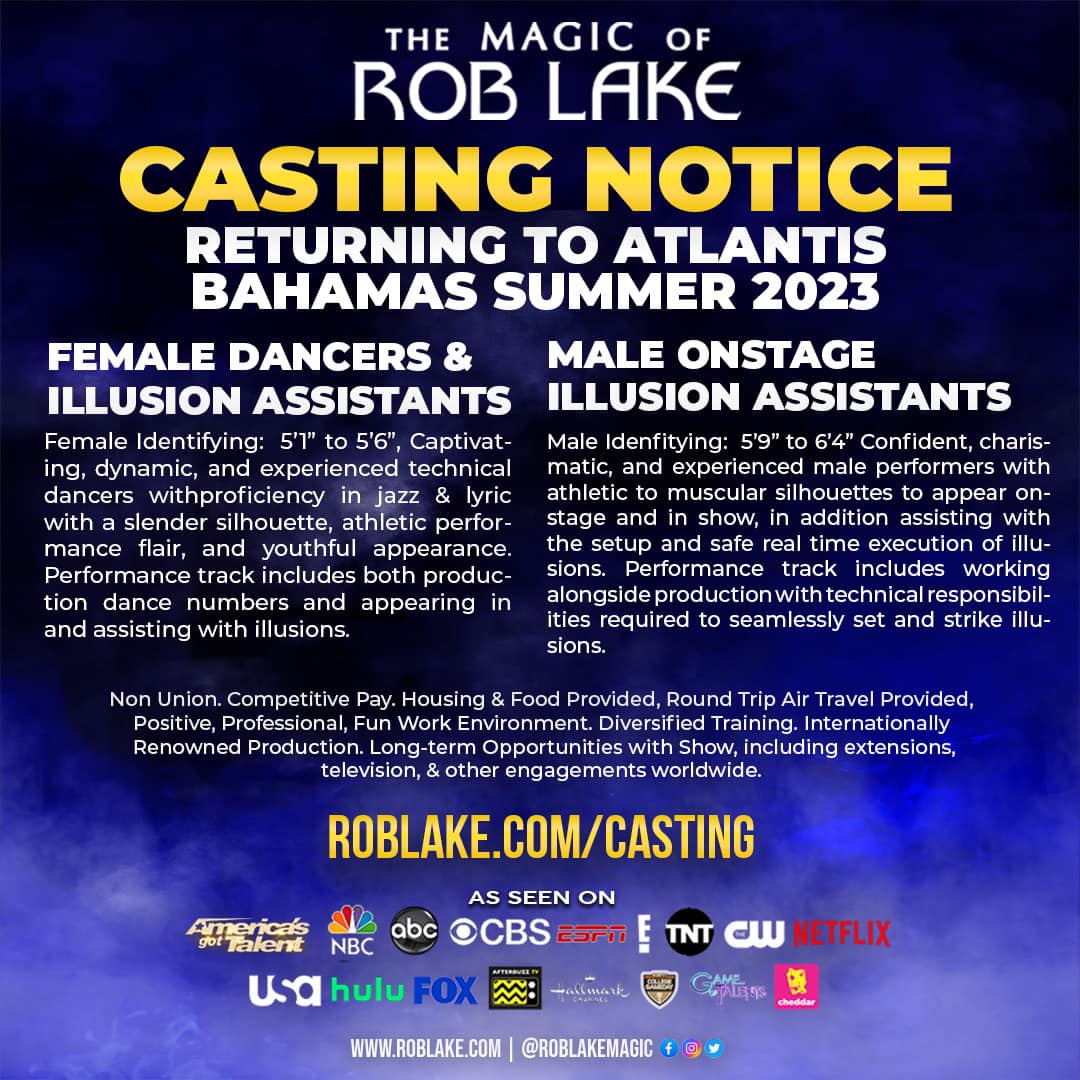 Casting for our summer contract at Atlantis Paradise Island Bahamas! Must have valid passport. Casting for dates starting July 2nd. Long-term Opportunities with Show, including extensions, television, & other engagements worldwide.
