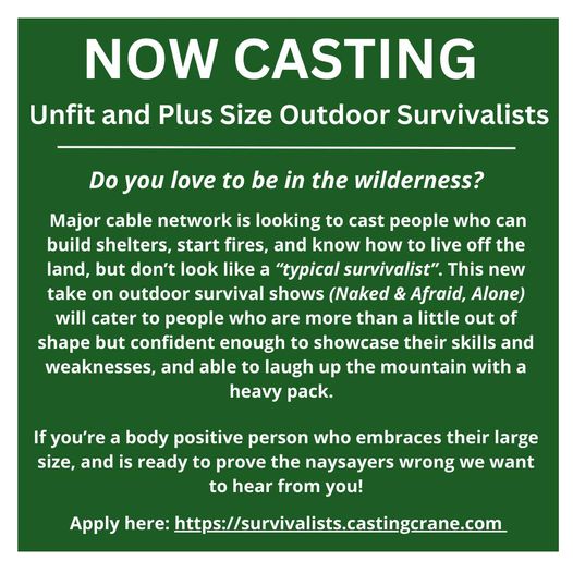 Also now casting for this same show – Now Casting Survival Show – of All Shapes and Sizes That are Outdoorsy