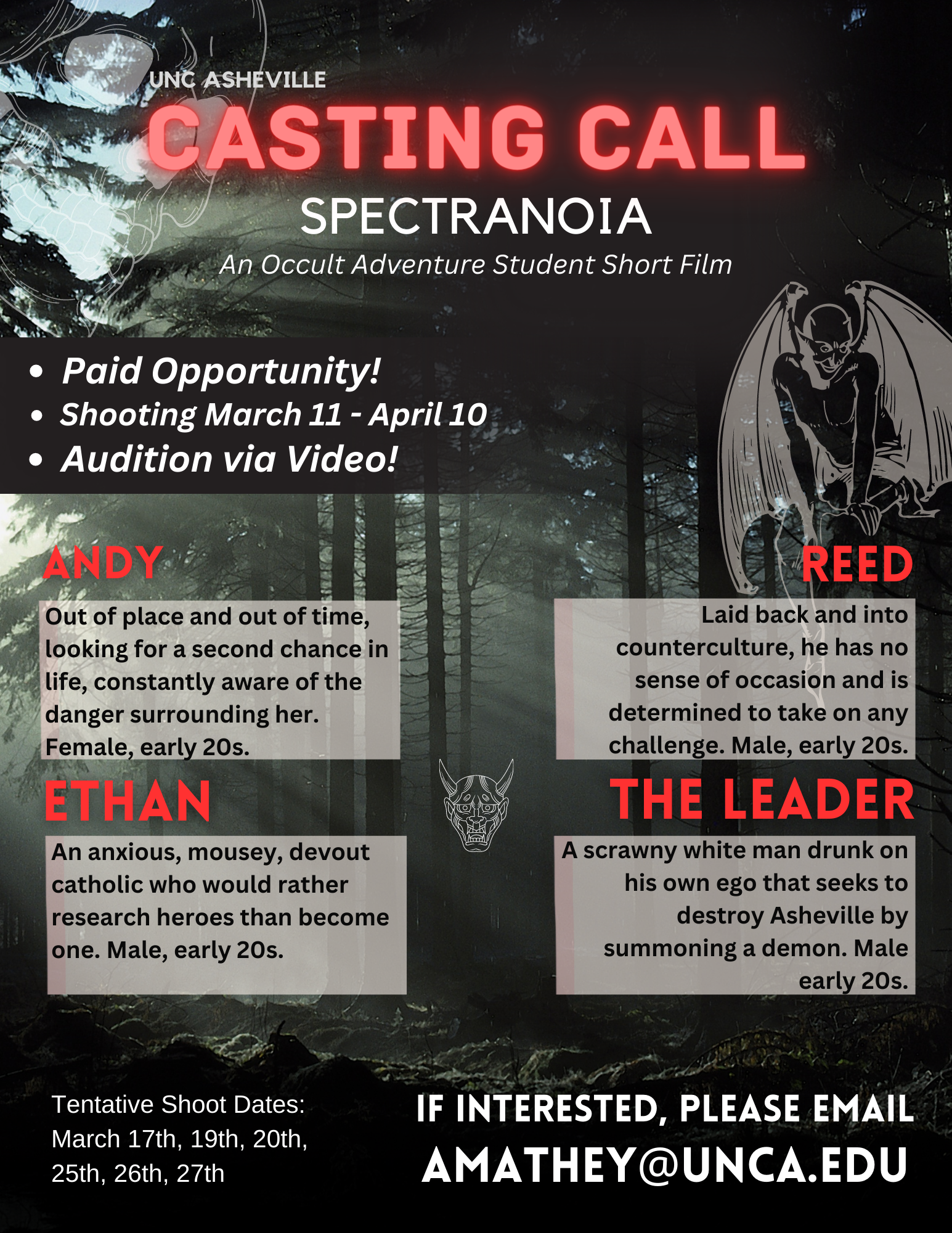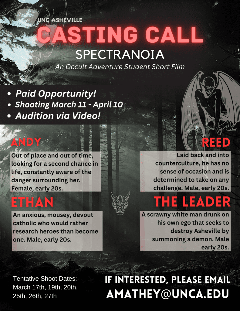 Seeking early 20s looking actors for occult comedy student short film Spectranoia. Shooting March 11th – April 10th (further scheduling details will be provided). Paid opportunity.