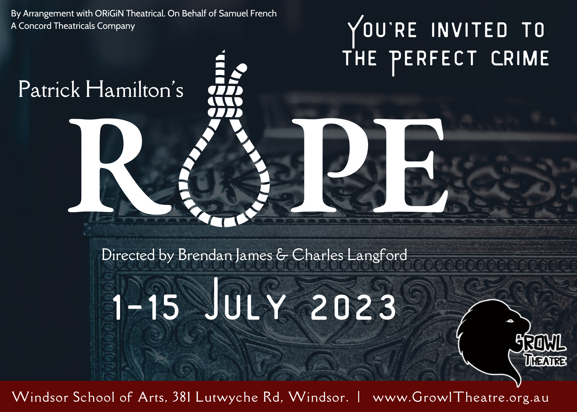 1) Download the Audition pack PDF (contains character descriptions, rehearsal schedule & audition script extracts) – https://growltheatre.org.au/wp-content/uploads/2023/02/Audition-Notice-ROPE.pdf
