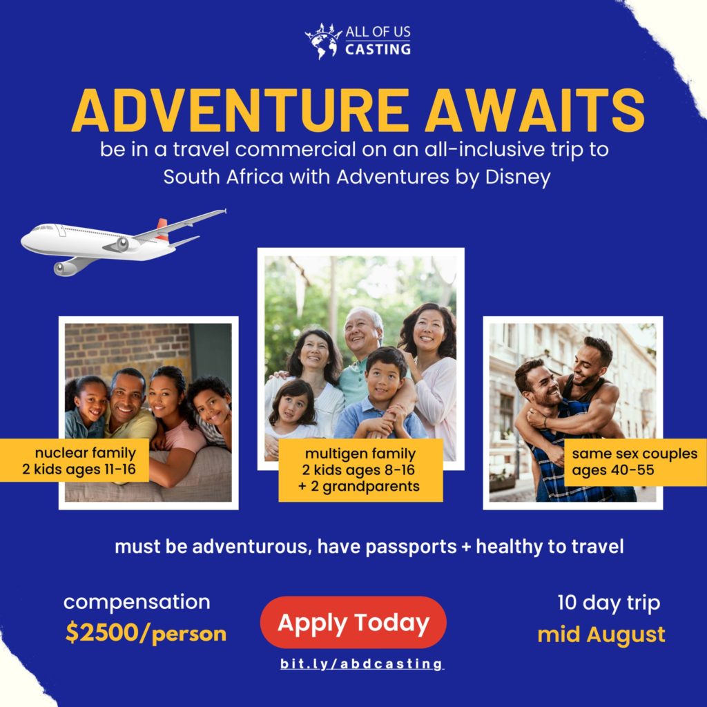 Disney Company Adventures By Disney is looking for some adventurous wanna be African explorers who would love a chance to take their families on an all paid trip to South Africa and actually get paid to take that family vacation.