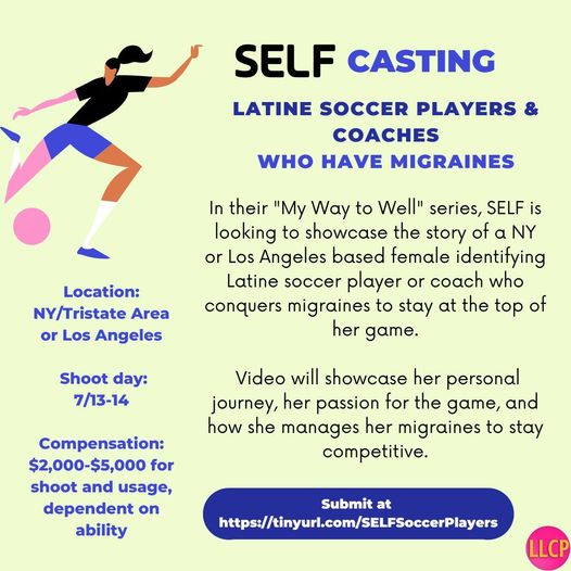 In the “My Way to Well” series, Self Casting is looking to showcase the story of New York and Los Angeles based female or female identifying Latine soccer players and soccer coaches who need to conquer their own migraines to stay on top of their game.