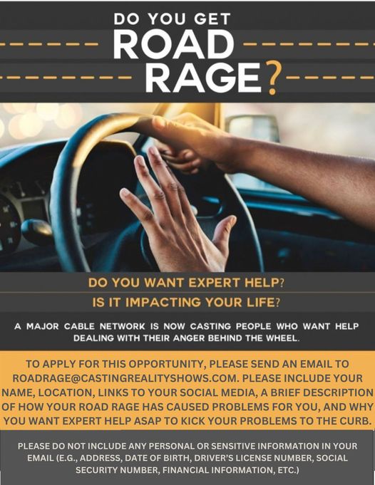 To apply for this opportunity, please send an email to roadrage@castingrealityshows.com. Include your name, location, links to your social media, a brief description of how road rage has caused problems for you, and explain why you want expert help to overcome this issue.