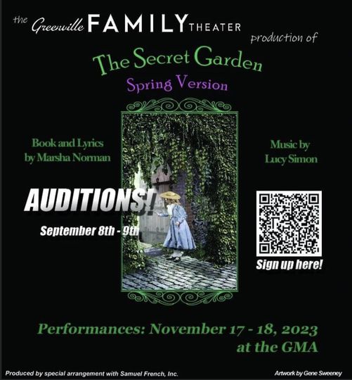 Everyone interested in participating will need to submit this Greenville Family Theater audition form and select a vocal audition time. Auditions are open for ages 7-18. Please see the QR code for the sign up details.