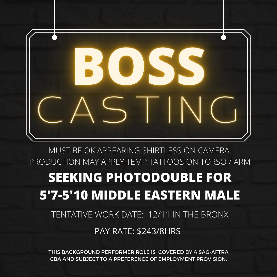 PHOTO DOUBLE for 5’7 – 5’10 #MiddleEastern Male on HBO’s BOSS! This photo double work will be shirtless. But NO FULL NUDITY. Production may apply temporary tattoos on your torso / arm.