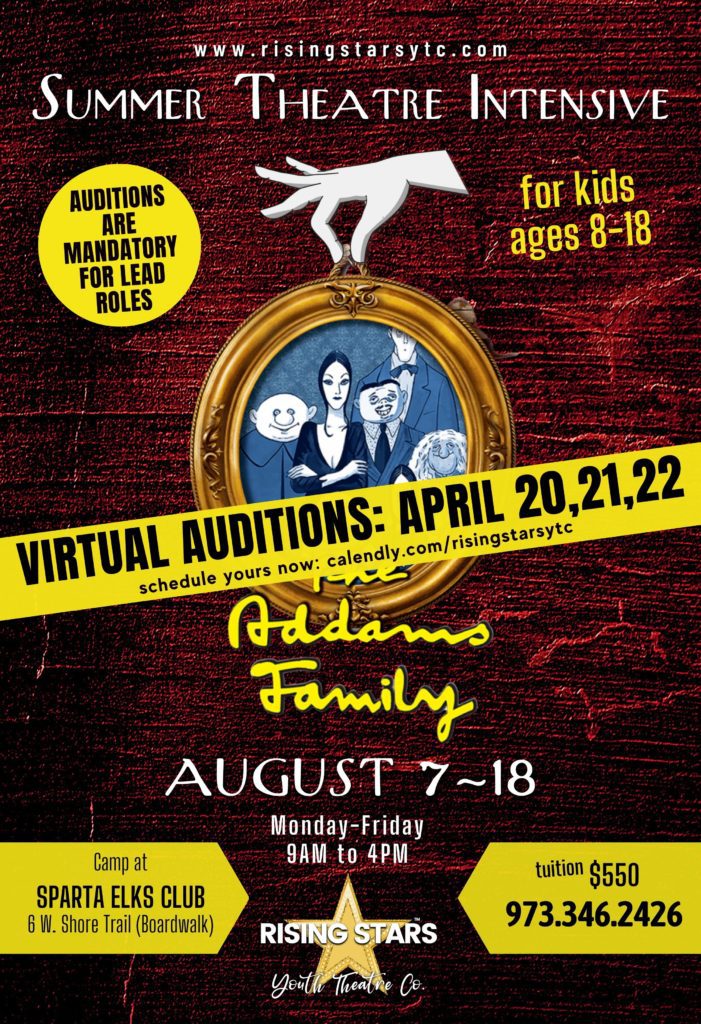 Rising Stars in Sparta, NJ is auditioning for our upcoming production of the Addams Family School Edition on April 20,21,22 online. This is for our summer theatre intensive 2023. The rehearsals will be August 7th-18th, Monday to Friday from 9:00 am – 4:00 pm. Performances are August 18th & 19th. Ages 8-18 only please.