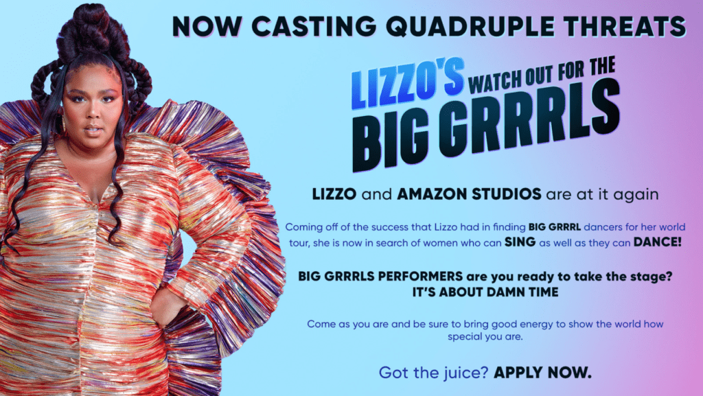The “Big Grrrls” casting call for plus-sized performers who back her up during Lizzo’s live performances and shows. Lizzo is holding auditions for quadruple threats to join her on the Amazon show “Lizzo’s Watch Out For The Big Grrrls.”