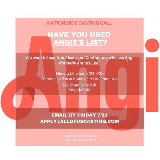 We want to hear your story! We are searching for both REAL users and contractors of Angi for an upcoming National commercial. The pay is $2,200 plus accommodations to/from San Francisco for the filming!