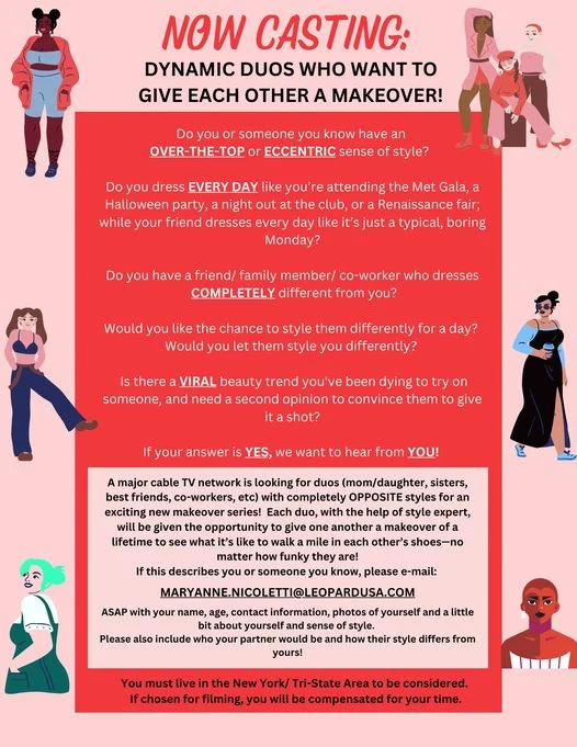 A major cable TV network is looking for duos (mom/daughter, sisters, best friends, co-workers, etc) with completely OPPOSITE styles for an exciting new makeover series! Each duo, with the help of style expert, will be given the opportunity to give one another a makeover of a lifetime to see what it’s like to walk a mile in each other’s shoes-no