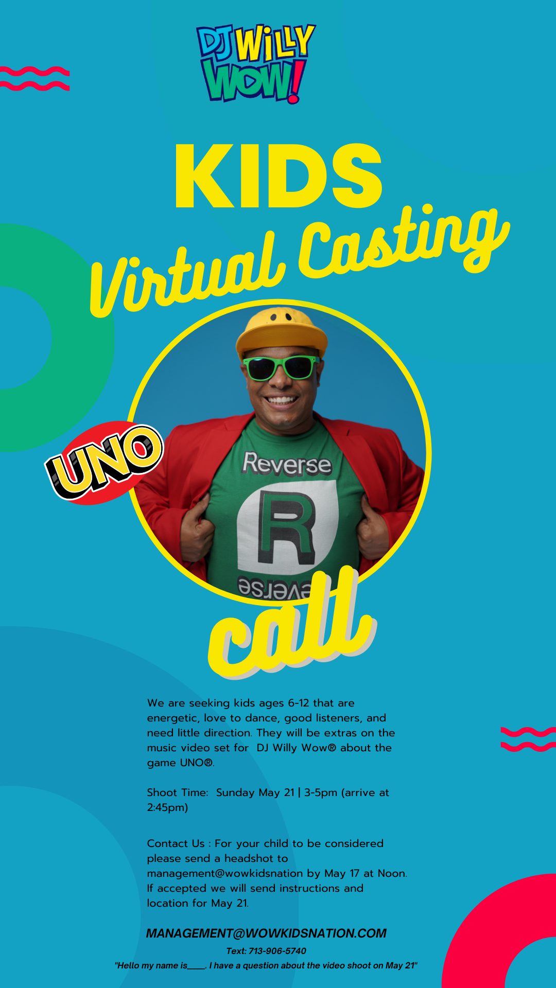 DJ Willy Wow, currently a personality on Sirius XM’s Kids Place Live and Grammy-Nominated kids artist, is casting for his video shoot taking place May 21, 2023 in Atlanta, GA.