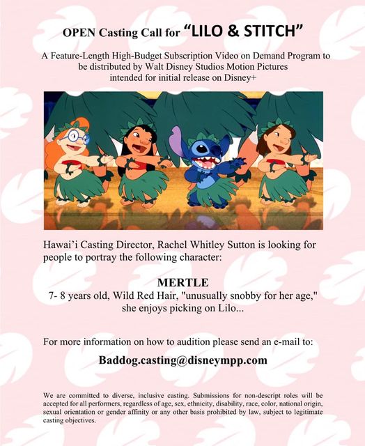 There have been multiple roles that the production had been trying to fill over the winter months. Seems that there may be another role to fill. The Disney role is that of a character named “Mertle” who is described as a 7 to 8 year old girl. “Mertle’s” character is also described as having wild red hair with an attitude that is much to snobby for her young age of 8. “Mertle” also is a character that picks on poor Lilo.