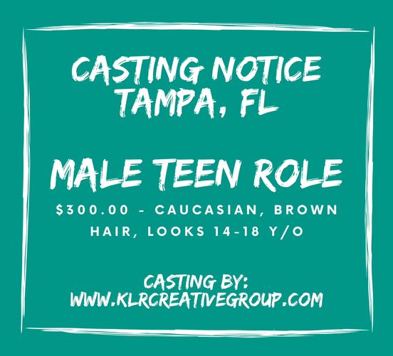 To submit: Email casting director Karlie Loland-Ringer at klrcreativegroup@gmail.com 3 current photos – Digital/cell phone face forward headshot, right or left profile headshot, body forward full length photo (no filters), a parent/guardian name and a phone number. Subject line should read “MALE TEEN”. The KLR Creative Group casting team will be in contact w/ further information if suited. Submission deadline is FRIDAY 5/19/23 by 12:00 PM.