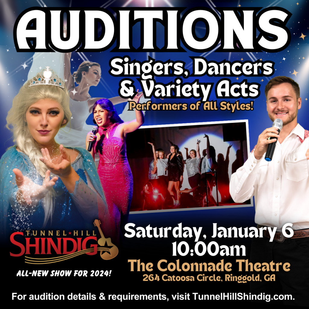 Please submit a resume/headshot and video reel to show@tunnelhillshindig.com. In-person auditions will be held on Saturday, January 6, 2024 at The Colonnade Theatre (264 Catoosa Circle, Ringgold, GA)