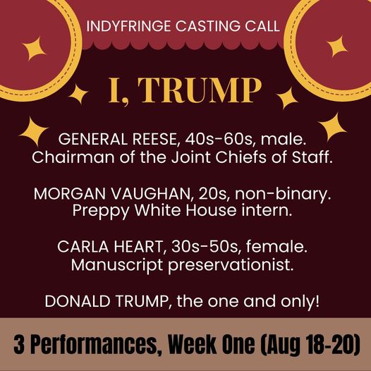 WHEN: 3 performances of 60 minute play “I, Trump” during the first weekend of the Indy Fringe Festival Aug 17-20th, 2023. Tech Rehearsal FRI 18 AUG 3-5pm. Performances (3) FRI 18 AUG 7:15-8:15, SAT 19 AUG 1:45-2:45pm, SUN 20 AUG 5:15-6:15pm. Also rehearsals at an earlier time locally TBD, and initial read throughs over ZOOM.