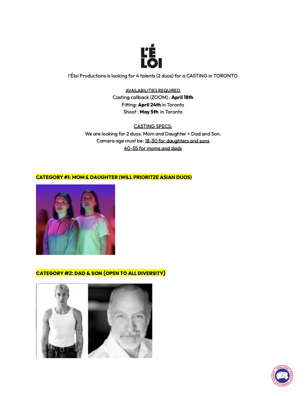 Casting directors are seeking to fill some very specific roles for talent that live in the Toronto, Ontario Canada area.