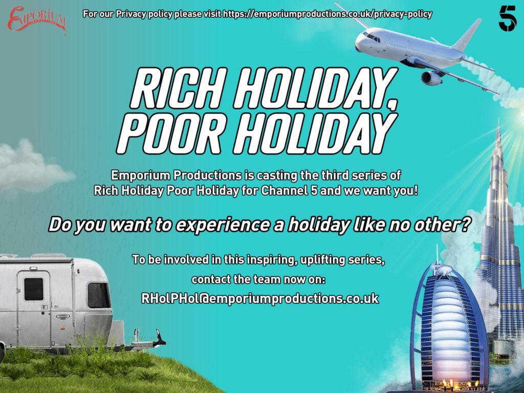 “Rich Holiday Poor Holiday” is a British reality television series that follows the adventures of two families with vastly different budgets as they swap homes and holiday experiences. Each episode features a wealthy family and a less well-off family who exchange homes and holiday plans for a week.