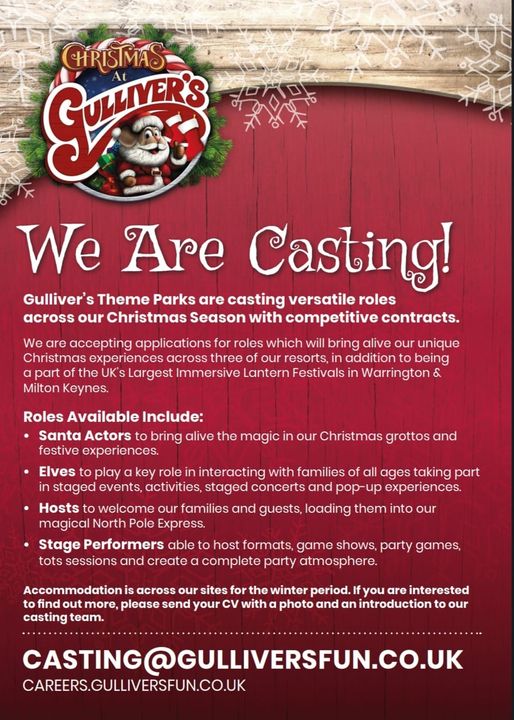 Gulliver’s Theme Parks are casting versatile roles across our Christmas Season with competitive contracts. We are accepting applications for roles which will bring alive our unique Christmas experiences across three of our resorts, in addition to being a part of the UK’s Largest Immersive Lantern Festivals in Warrington & Milton Keynes.