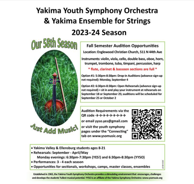 The Yakima Youth Symphony Orchestra and the Yakima Ensemble for Strings will be holding open auditions for the 2023-2024 season this fall.