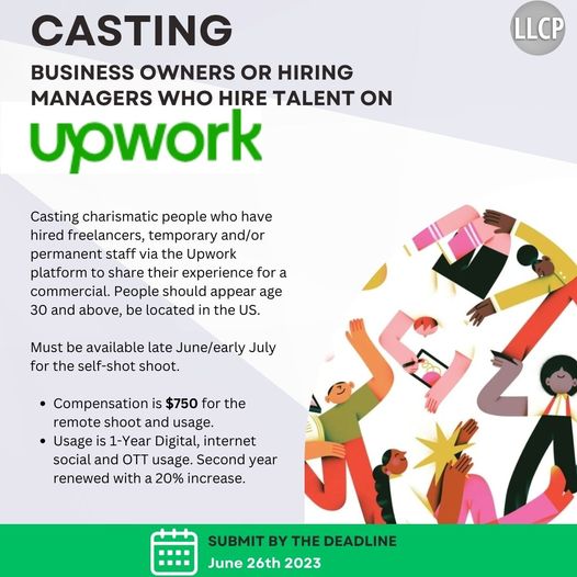 Casting charismatic people who have hired freelancers, temps and/or permanent staff on Upwork Platform to share their experience for an upcoming commercial project. The commercial is looking for people who appear to be at least 30 years of age or above and be located in the United States.