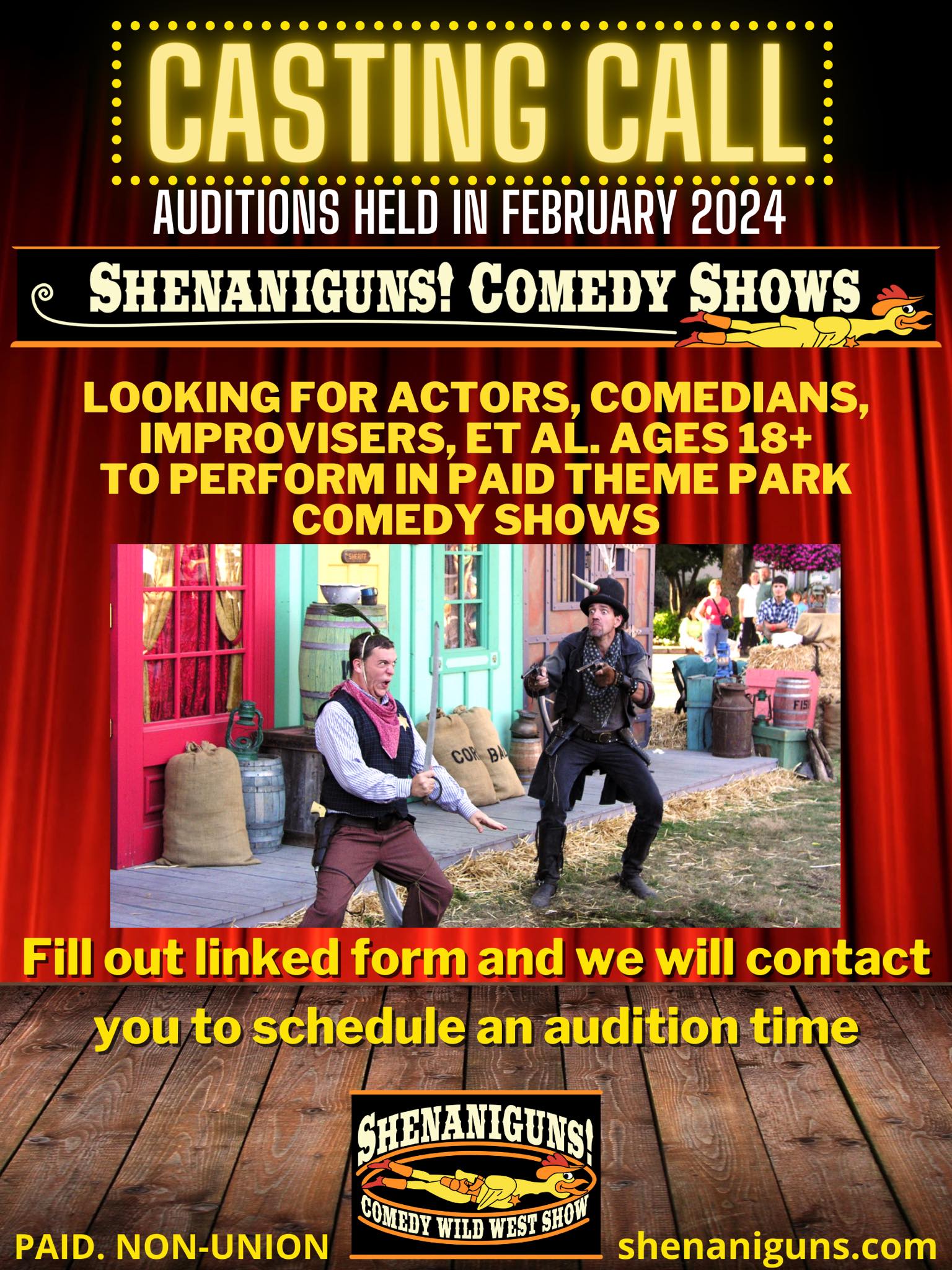 Now casting actors aged 18 and above for ShenaniGuns! Comedy Shows at Six Flags over Georgia.