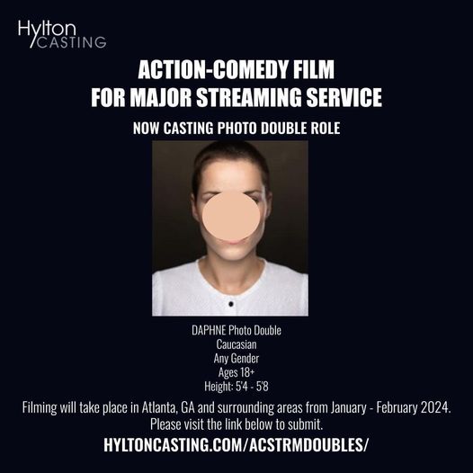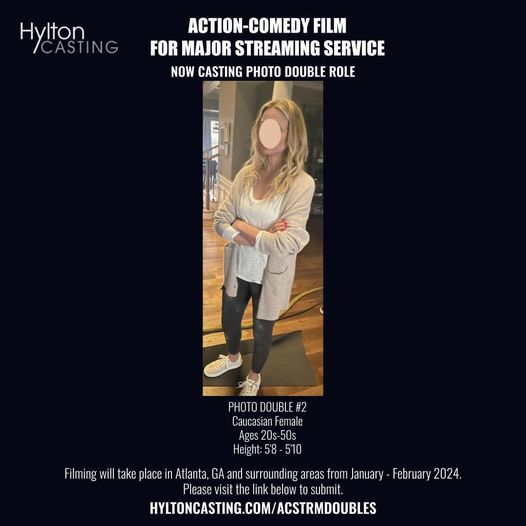 Hylton Casting is currently casting the following photo double for an upcoming action-comedy film from a major streaming service. Filming will take place in Atlanta, GA and surrounding areas from January – February 2024.