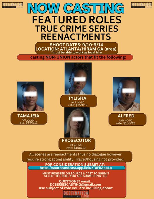 A new true crime series is currently casting for featured roles in reenactments, filming in the Atlanta/Hiram, GA area from September 10th to 14th, 2024. This production is seeking non-union actors who are local to the area and match the following descriptions: