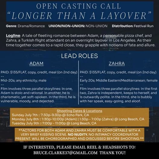 Logline: Longer Than a Layover explores the ephemeral romance between Adam, an engaging pizza chef, and Zahra, a Turkish flight attendant during her overnight layover in Los Angeles. As their brief encounter nears its end, they face the challenges of fate and attraction.