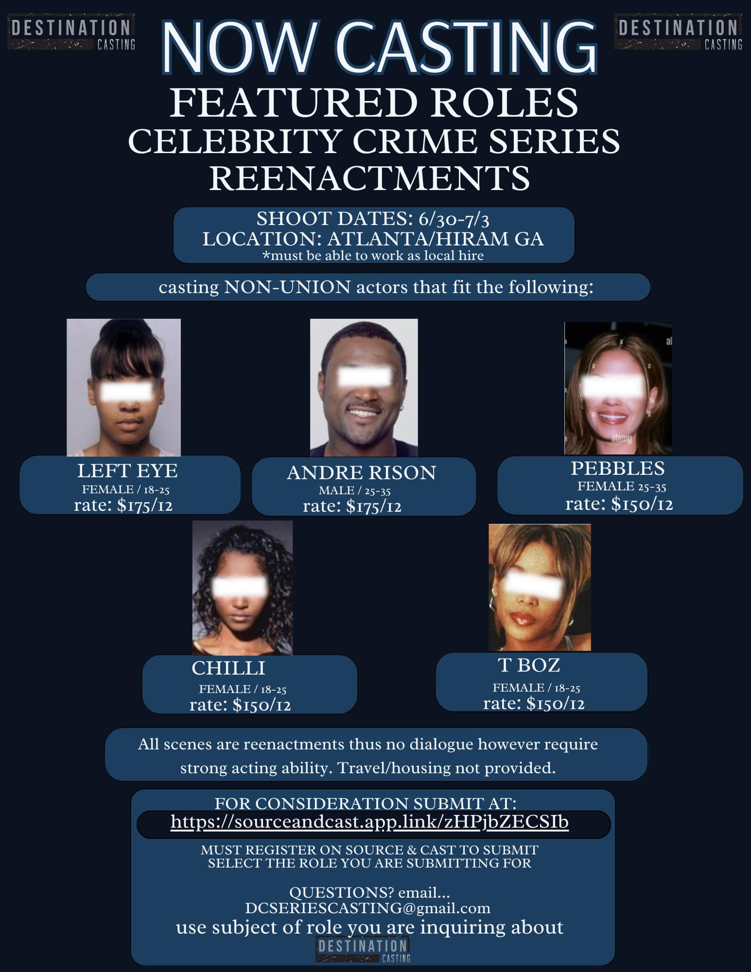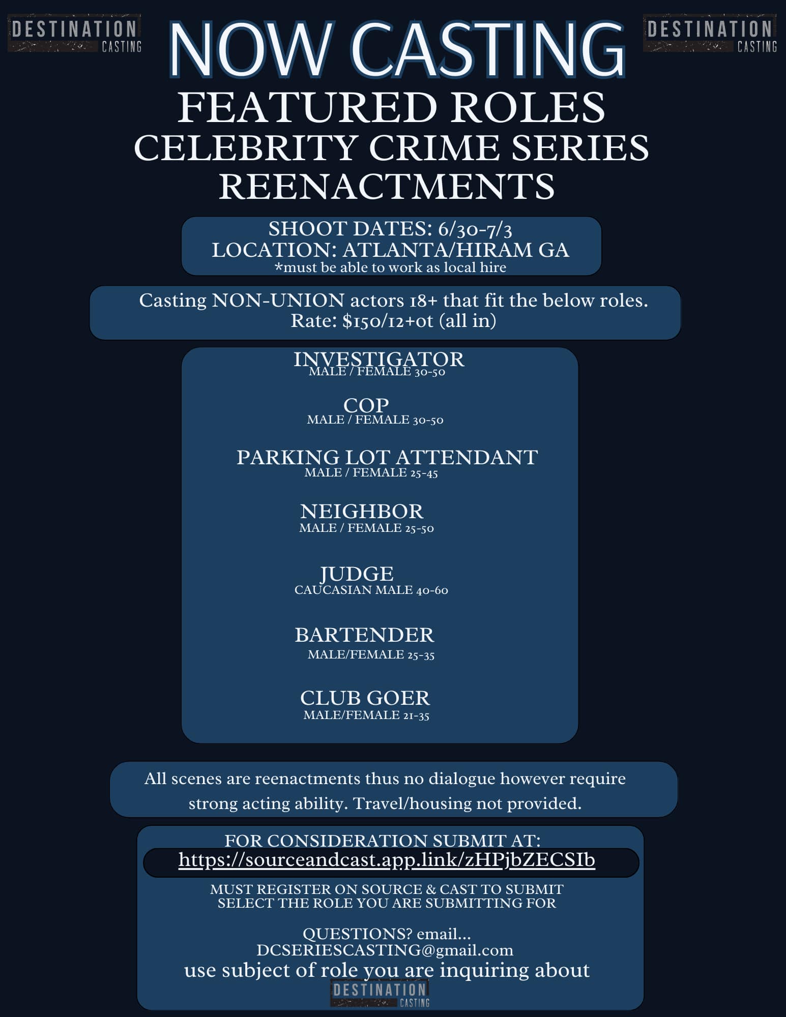 NOW CASTING FOR A NEW EPISODE OF A CELEBRITY CRIME SERIES IN ATLANTA GA AREA! 6/30-7/3