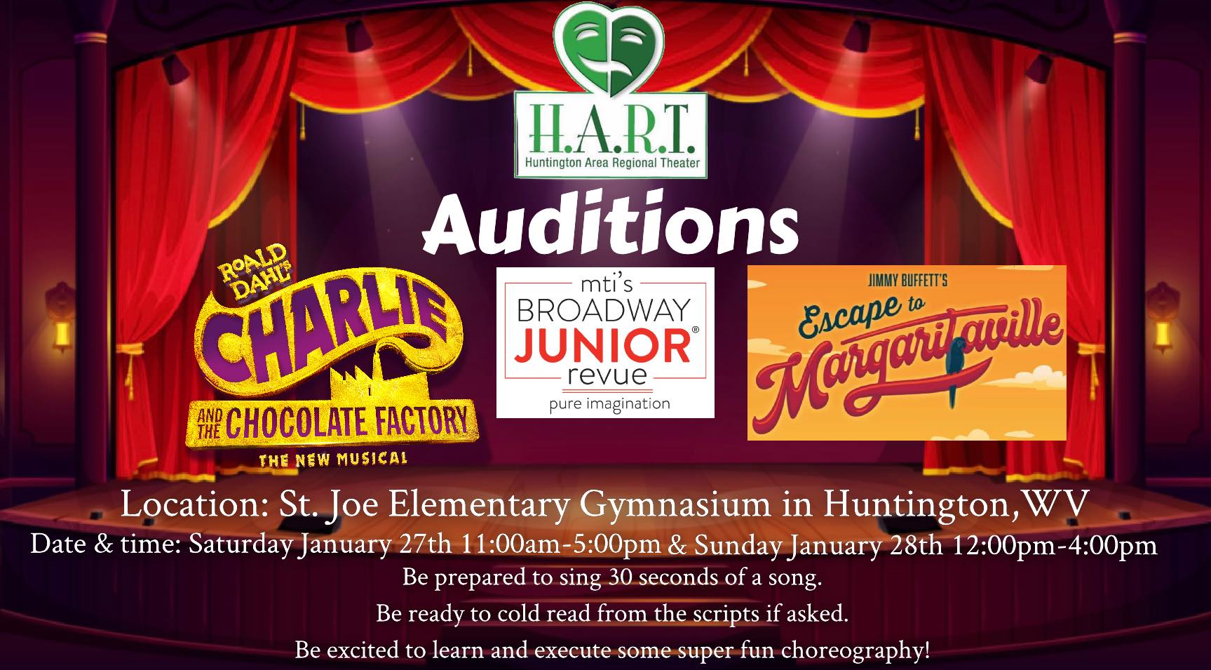Huntington Area Regional Theater in Huntington, West Virginia is holding auditions.