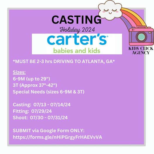 CASTING Holiday 2024 – Carter’s babies and kids – Auditions for kids, baby and Toddlers on Carter’s Exclusive Brands this holiday season.