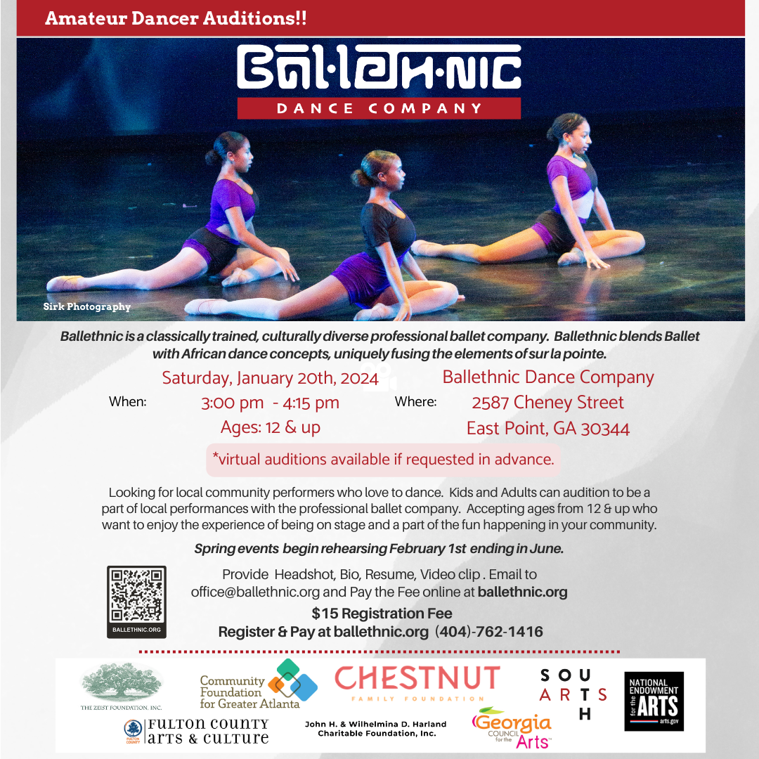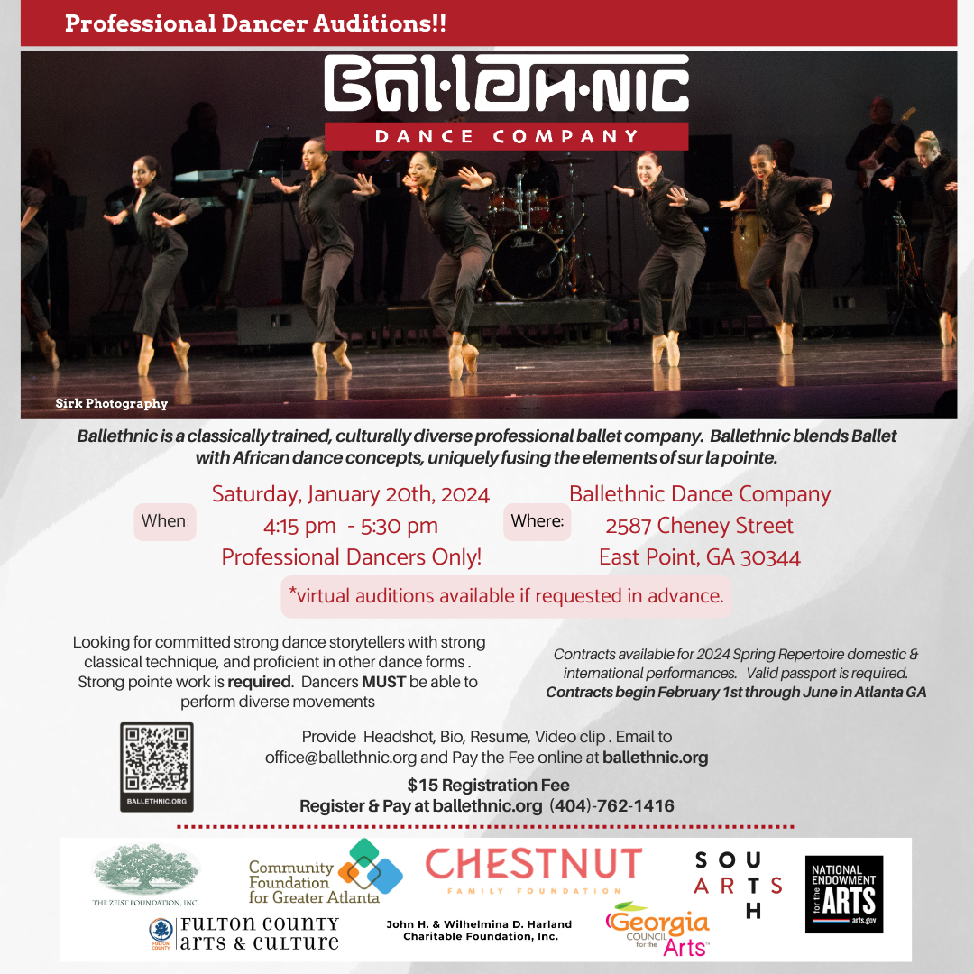 Virtual auditions available, if requested at least 24 hours in advance. Email request to office@ballethnic.org