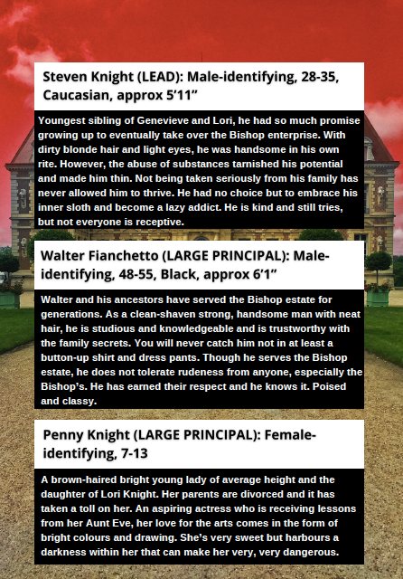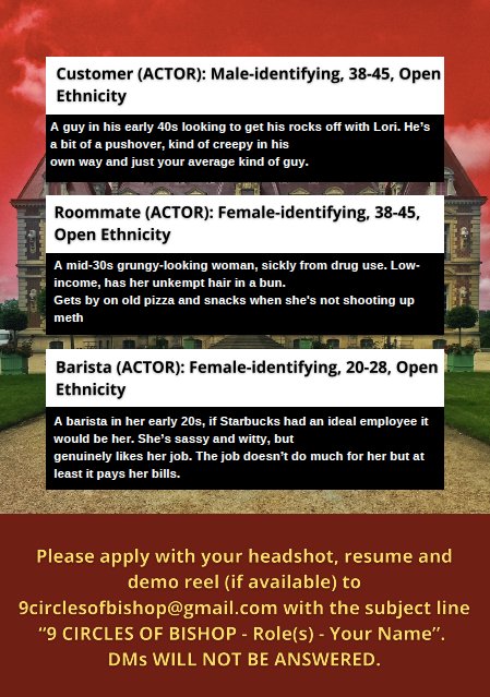 - Send your headshot(s), resume, and demo reel (if available) to 9circlesofbishop@gmail.com