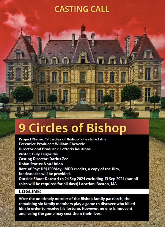 Reveel is excited to announce a casting call for 9 Circles of Bishop, a feature film set in Boston. We are looking to cast a total of 22 roles. Interested actors should review the attached character descriptions and specifications carefully.