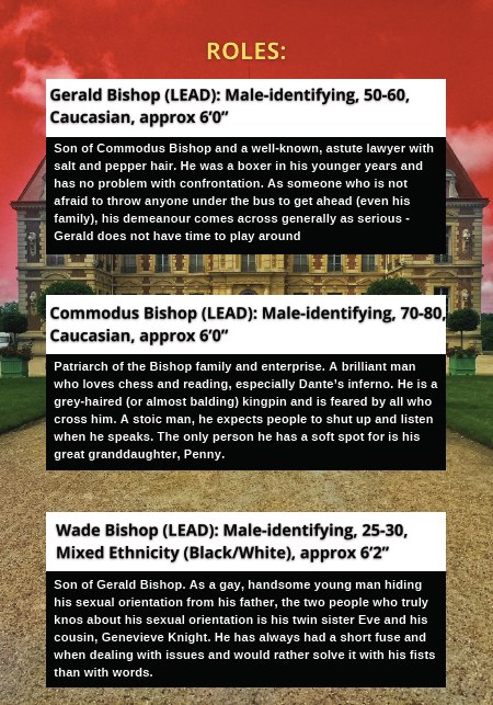 After the untimely murder of the Bishop family patriarch, the remaining six family members play a game to discover who killed him in order to receive his fortune. However, no one is innocent, and losing the game may cost them their lives.
