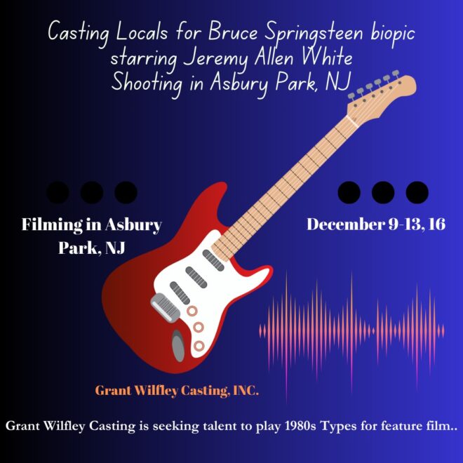 TCS Louisiana Productions is currently casting local background actors for an upcoming feature film about the life of Bruce Springsteen, starring Jeremy Allen White. The movie is set in the 1980s and will be shooting in Asbury Park, NJ from December 9th to 13th, and on December 16th, 2024.