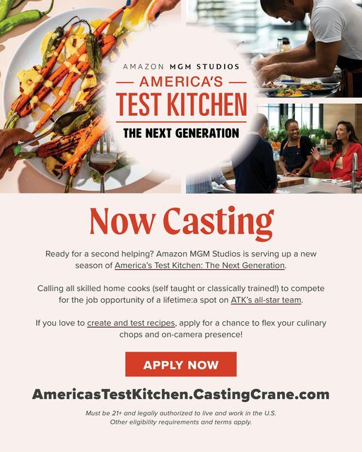 For those ready to take their cooking journey to the next level, apply now at AmericasTestKitchen.CastingCrane.com. Participants must be 21 or older, legally authorized to live and work in the U.S., and adhere to other eligibility requirements and terms. Don’t miss the chance to make your mark in the kitchen!