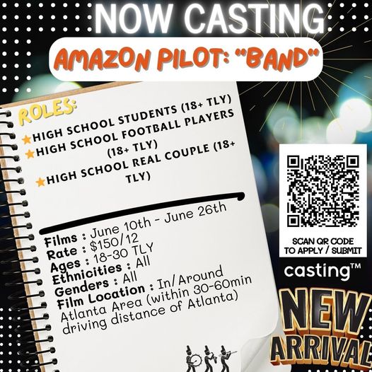 Casting TaylorMade is announcing a casting call for the Amazon pilot “Band,” set in modern day. They are looking to book high school student roles, including football players and real couples, for filming from June 10th through June 26th in and around Atlanta.