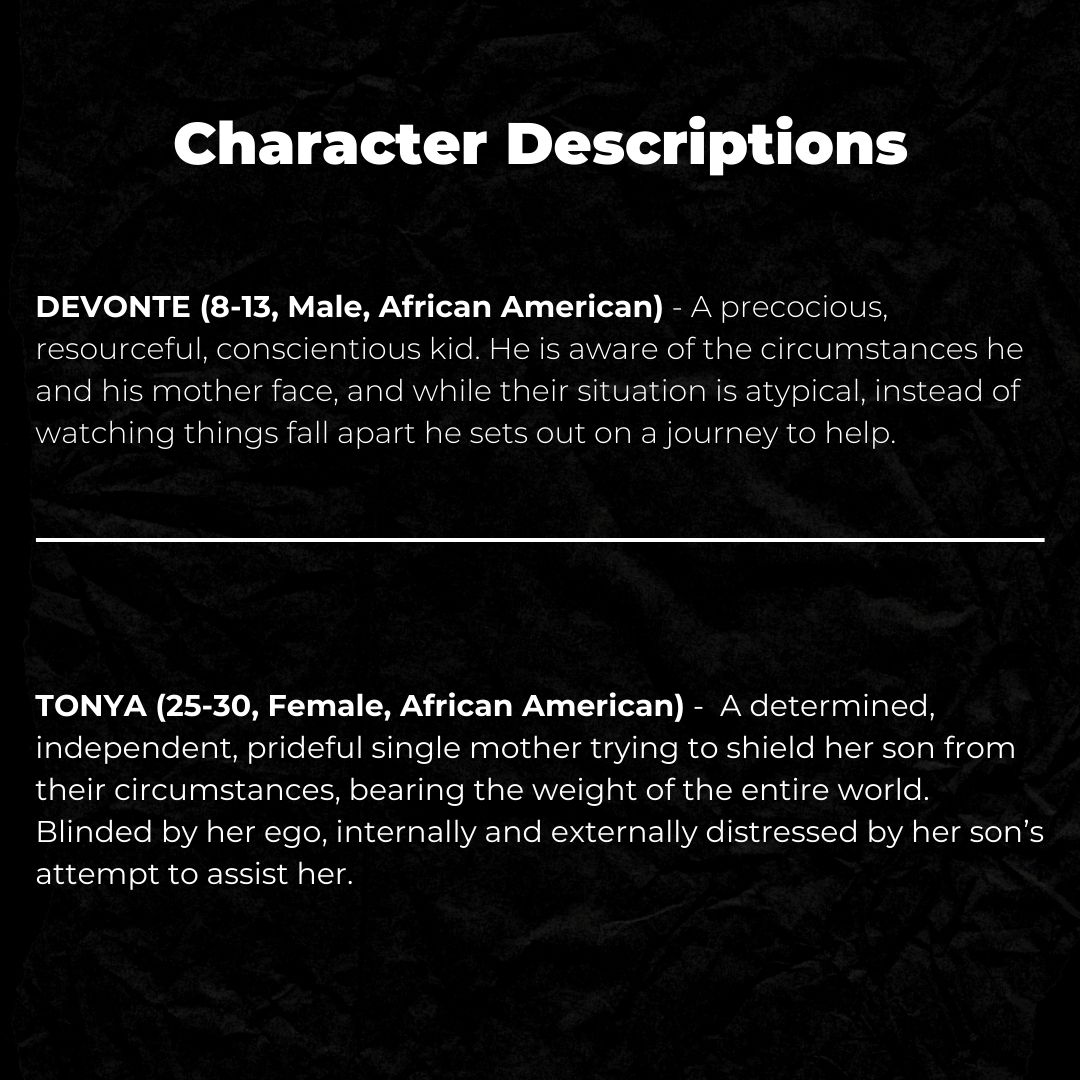 Casting for the roles of DEVONTE (8-13, MALE, AFRICAN AMERICAN) & TONYA (25-30, FEMALE, AFRICAN AMERICAN) for the short film “taraji”