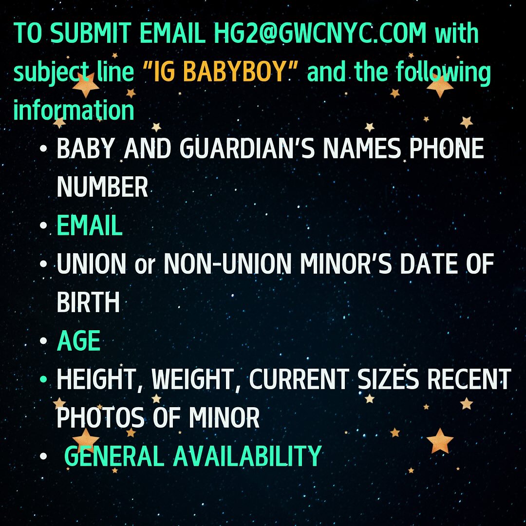 TO SUBMIT EMAIL HG2@GWCNYC.COM with subject line “IG BABYBOY” and the following information:
