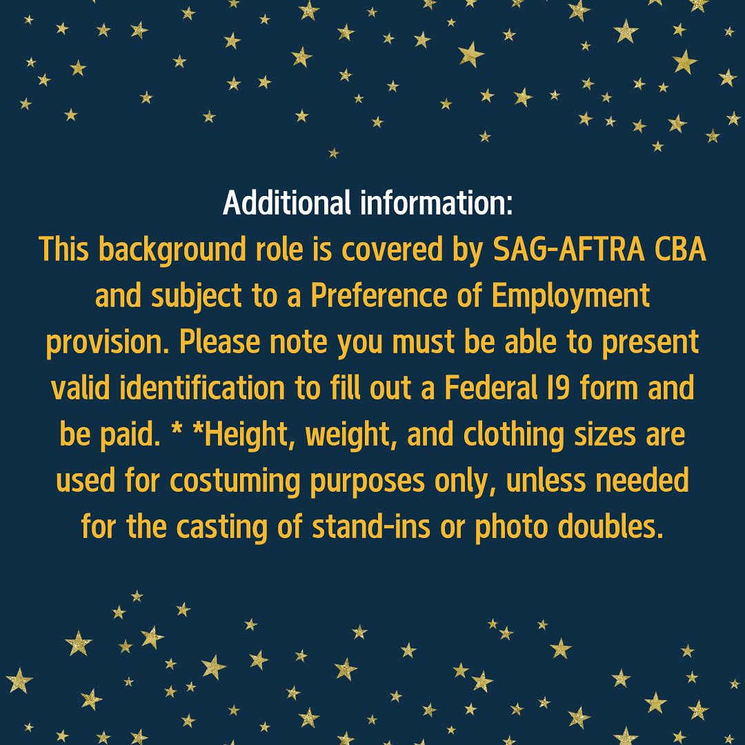 This background role is covered by SAG-AFTRA CBA and subject to a Preference of Employment provision. Please note you must be able to present valid identification to fill out a Federal 19 form and be paid.
