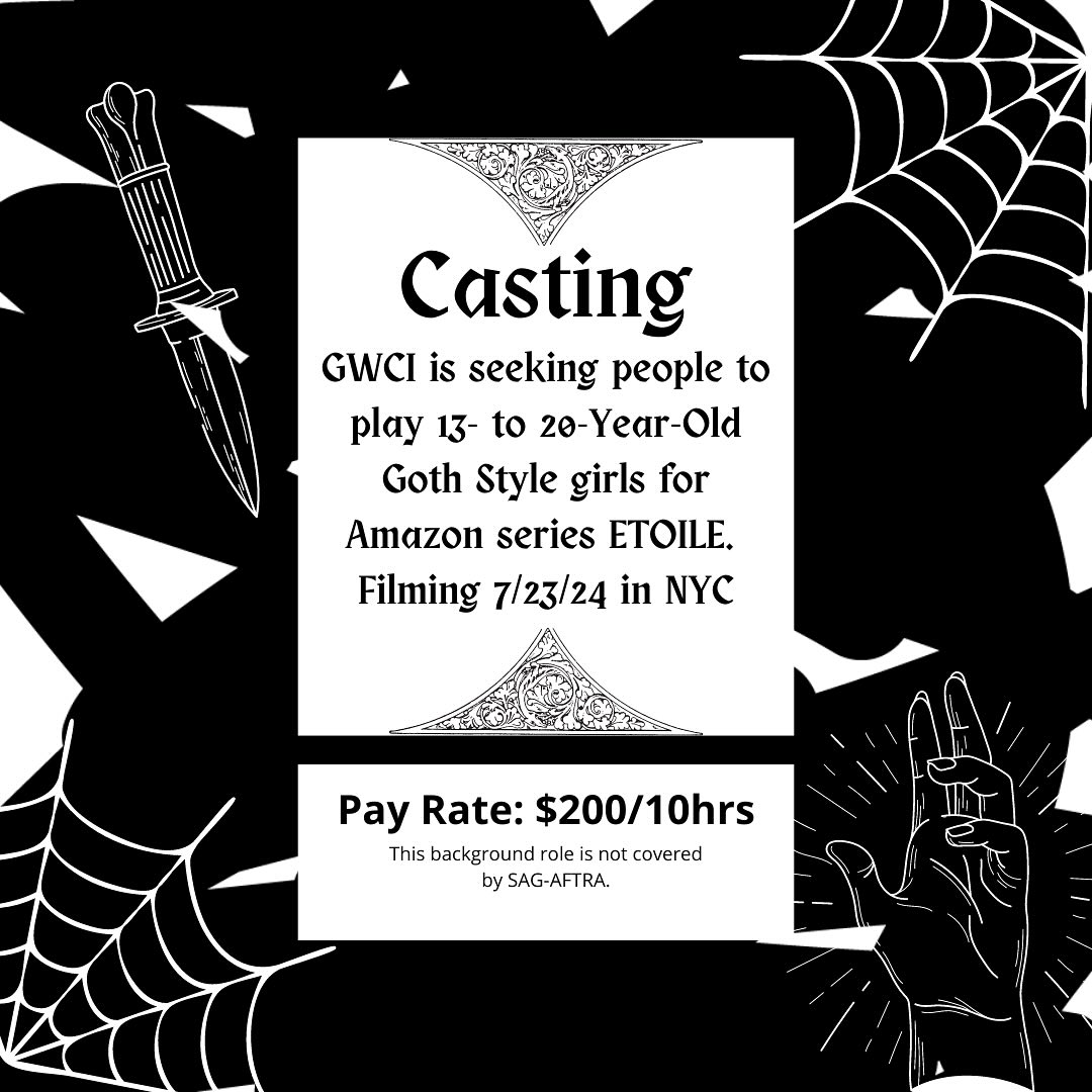Casting – GWCI is seeking people to play 13- to 20-Year-Old Goth Style girls for Amazon series ETOILE. Filming 7/23/24 in NYC