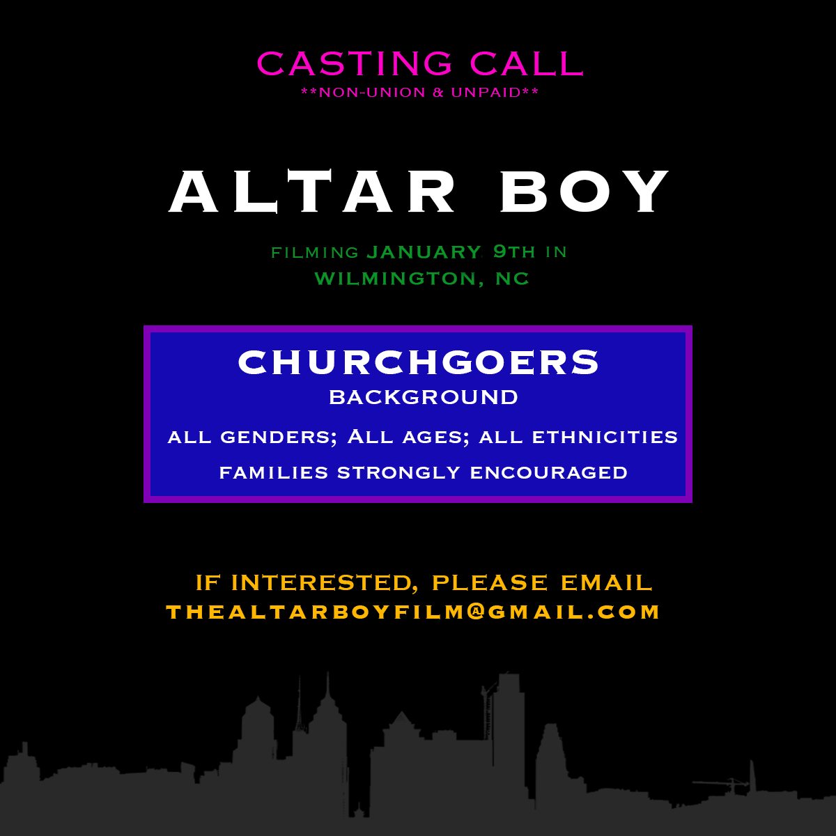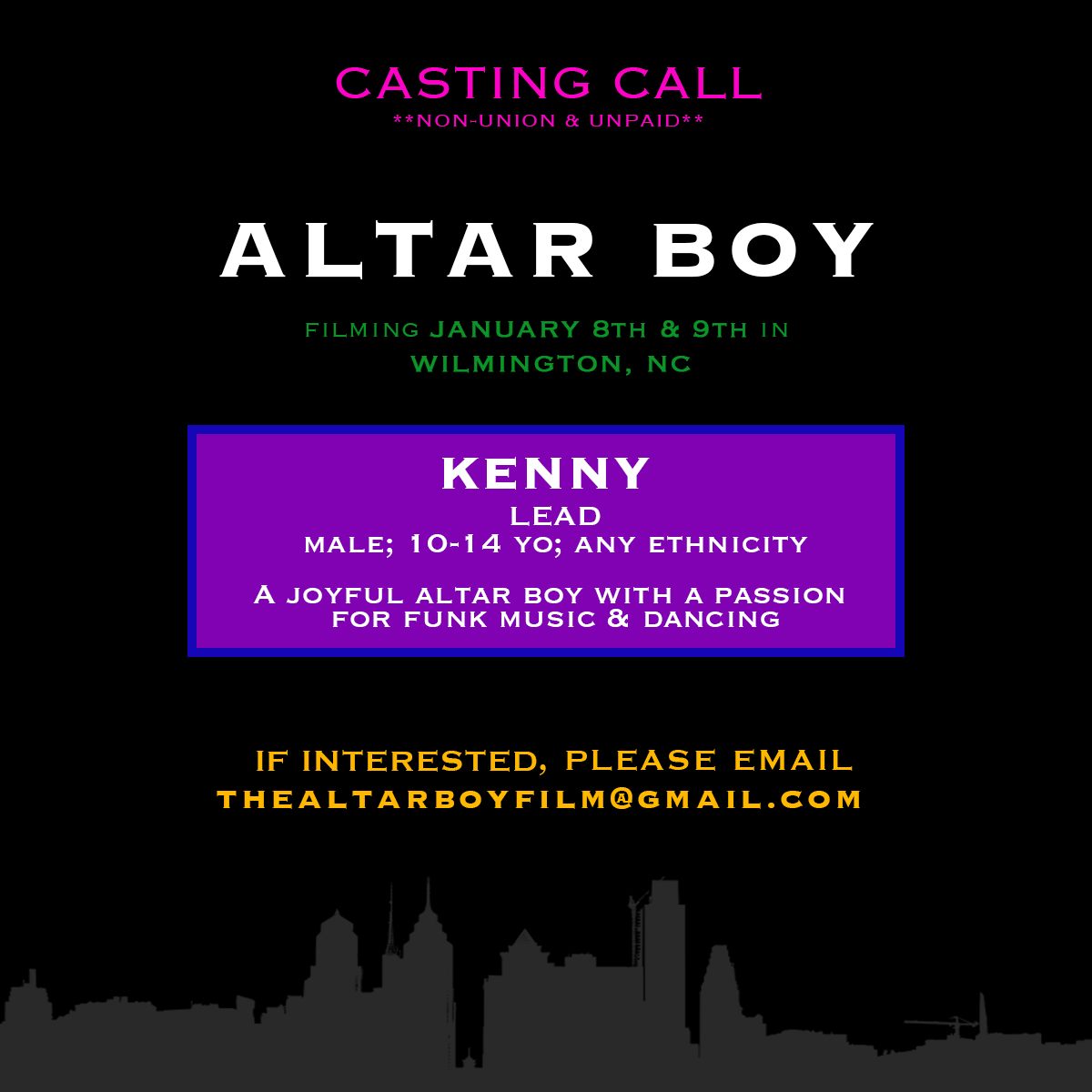 IF INTERESTED, please email ABBY WALKUR at thealtarboyfilm@gmail.com for more information.