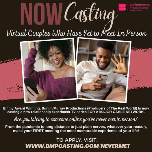 Bunim/Murray Productions, renowned for The Real World, is in their search for virtual couples for an exciting new relationship experiment TV series on a major cable network. Have you been connecting with someone online whom you’ve never met face-to-face? Whether it’s due to the pandemic, long-distance challenges, or simply nerves, this series promises to make your first meeting unforgettable.