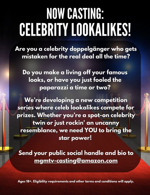 Producers are developing a new competition series where celeb lookalikes compete for prizes. Whether you’re a spot-on celebrity twin or just rockin’ an uncanny resemblance, we need YOU to bring the star power!