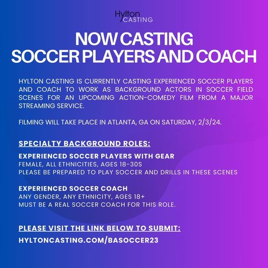 Hylton Casting is currently casting experienced soccer players to work as background actors in soccer field scenes for an upcoming action-comedy film from a major streaming service.