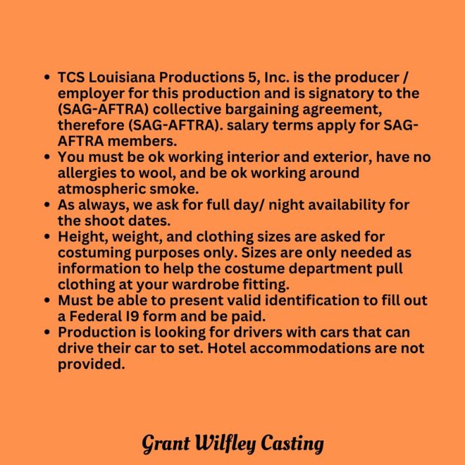 - Full Day Availability: Extras must have full availability for all scheduled shoot days, as specific call times will not be released until the night before.